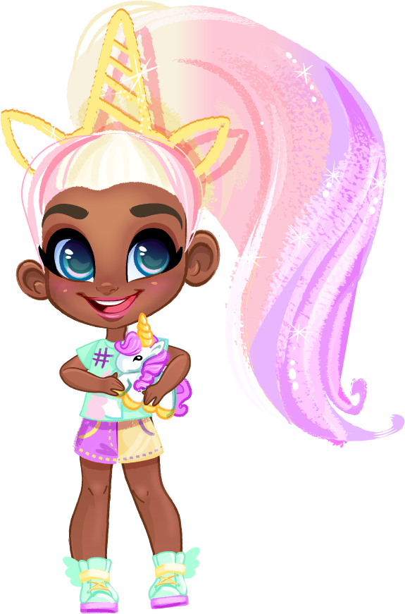 - Face: Open mouthed smile, hot pink lips.