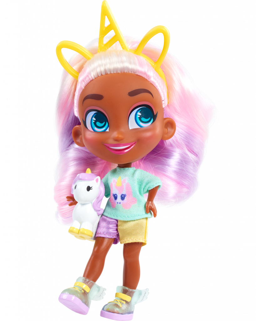 Whit unicorn toy with a purple mane and yellow hooves and horn.